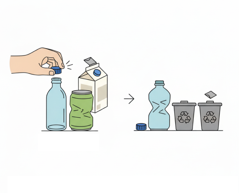 Wyrzucaj szkło i kartony po sokach i mleku bez kapsli i nakrętek. Po odkręceniu posegreguj je do odpowiednich pojemników.